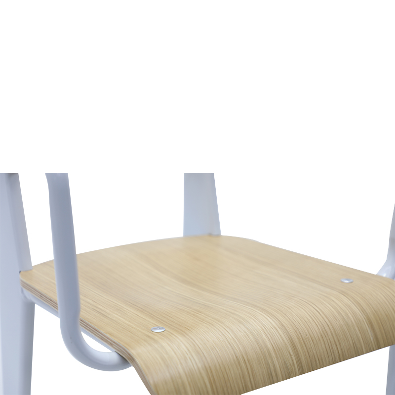 The oak wood seat metal steel armchair is made from metal steel frame and combine with plywood veneer seat and back. The metal frame is sturdy and durable to provide good weight bearing and meet commercial grade which ensure the quality. The wood used at the seat and back is designed as curved to provide a comfortable fit and aesthetic appearance. The metal and wood combination lends it a modern sense look and bring a perfect view from all side. In addition, the angle of the legs and design provides a more decorative appearance. The metal frame can be painted with different colors. Different wood for optional. The industrial chair can be used with or without cushions.